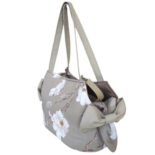 Borsa trasportino in tessuto fantasia a poix e con fiocchi laterali.